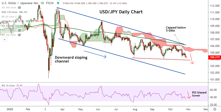 USD/JPY was trading 0.12% lower on the day at 104.29 at around 08:45 GMT, outlook remains bearish.