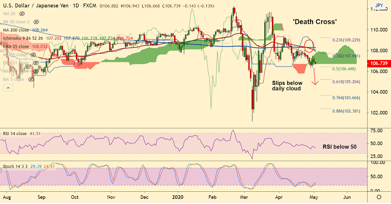 21-EMA caps upside and price action is extending downside below 200-DMA. Break below cloud will see further downside.