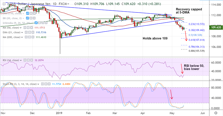 - Recovery lacks traction. Upside capped at 5-DMA. Break above finds next major resistance at 110.31 (cloud base).