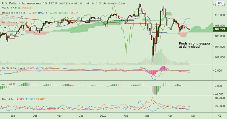 Strong resistance is seen at 21-EMA (107.82). Bearish invalidation only above 200-DMA (108.29).