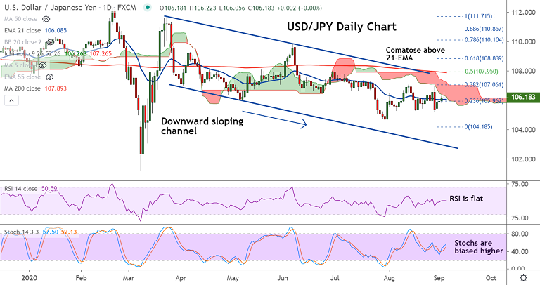 As USD/JPY trades comatose between 21-EMA and daily cloud, US August Non-Farm Payrolls report awaited for impetus.