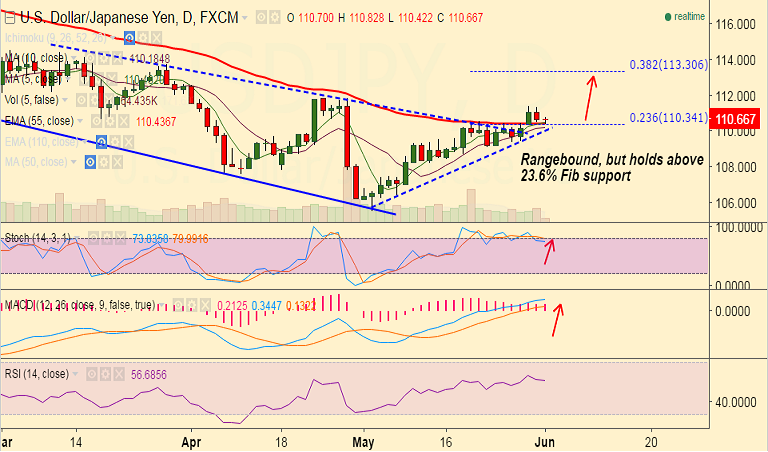 - Upside in the pair intact till support at 110.34 (23.6% Fib) holds.