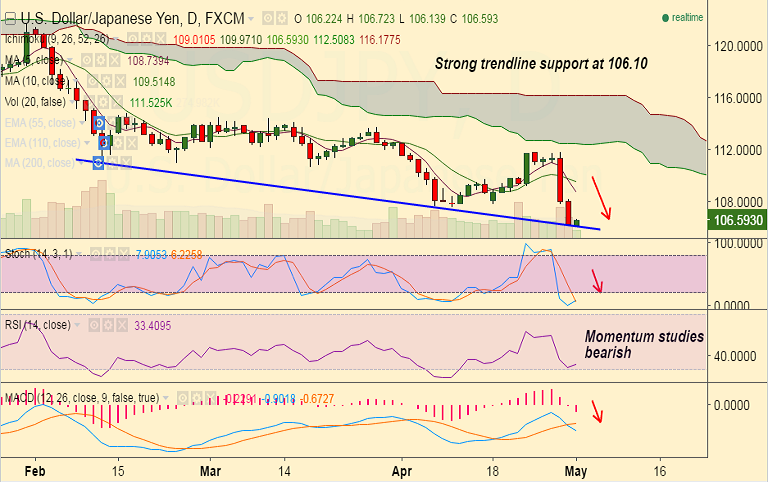 - Pair is holding strong trendline support at 106.10 levels, breaks below will drag the pair to 105.50 levels.
