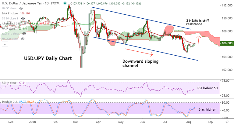 Summary: USD/JPY keeps scope for upside. Oscillators are biased higher. Breakout above 21-EMA will buoy bulls in the pair. Major trend is bearish and hence upside may be limited.