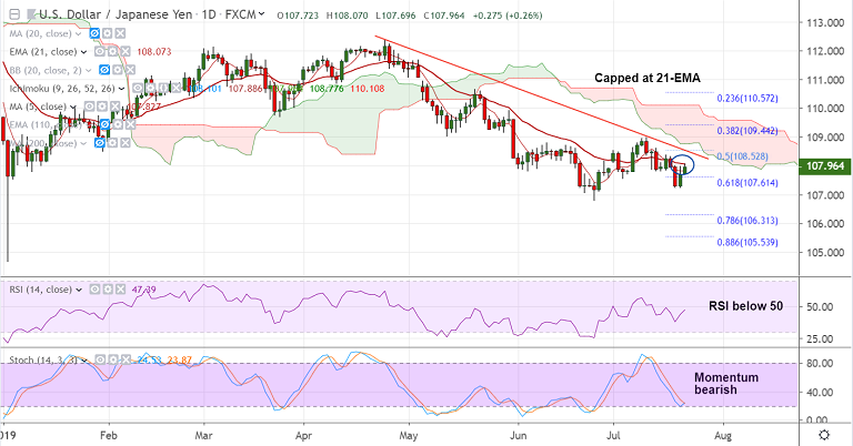 Upside look limited. Stiff resistance seen at 108.08 (converged 200H SMA and 21-EMA). Break above could see gains till 50-DMA at 108.52.