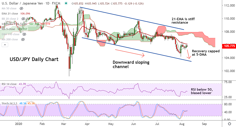 Recovery in the pair lacks traction, upside capped at stiff resistance at 21-EMA at 106.09.