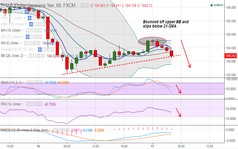 - On hourly charts, we see the pair has bounced off upper Bollinger band, Stochs have rolled over from oversold and RSI is biased lower.