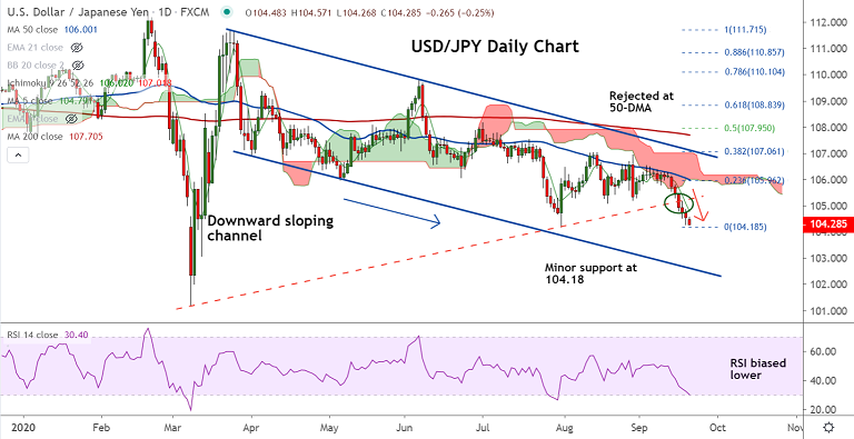 USD/JPY was trading 0.26% lower on the day at 104.28 at around 04:00 GMT, outlook bearish.
