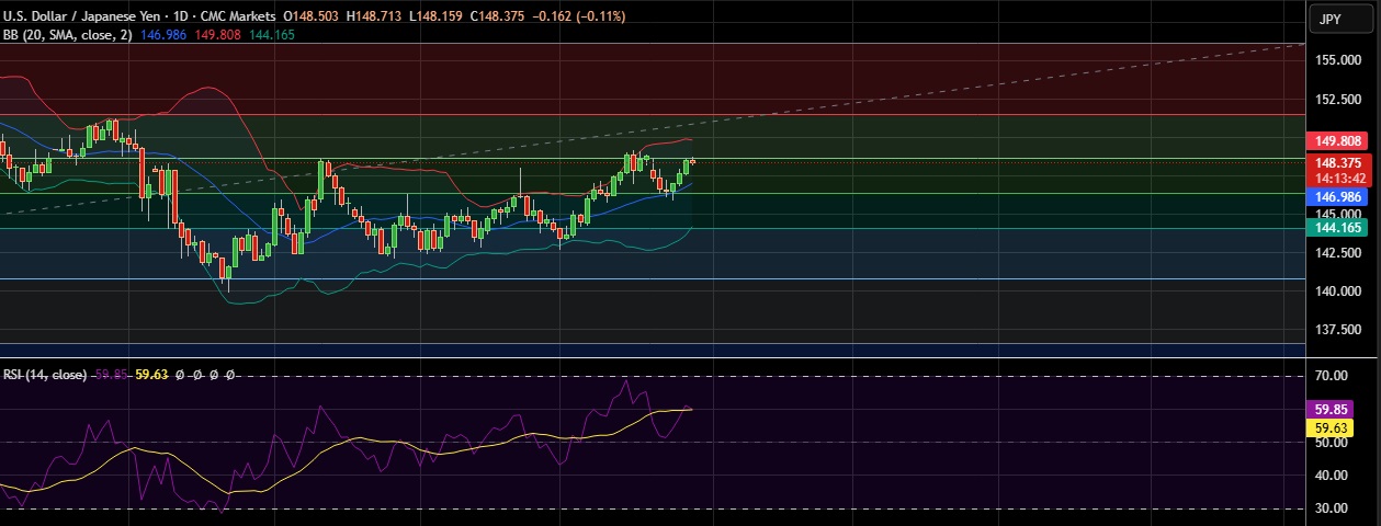 • Immediate resistance is located at 148.72(38.2%fib), any close above will push the pair towards 149.85(Higher BB).