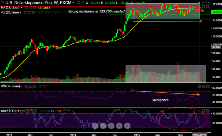 Strong resistance at 123.700 rejected and heading towards support at 118.755.
