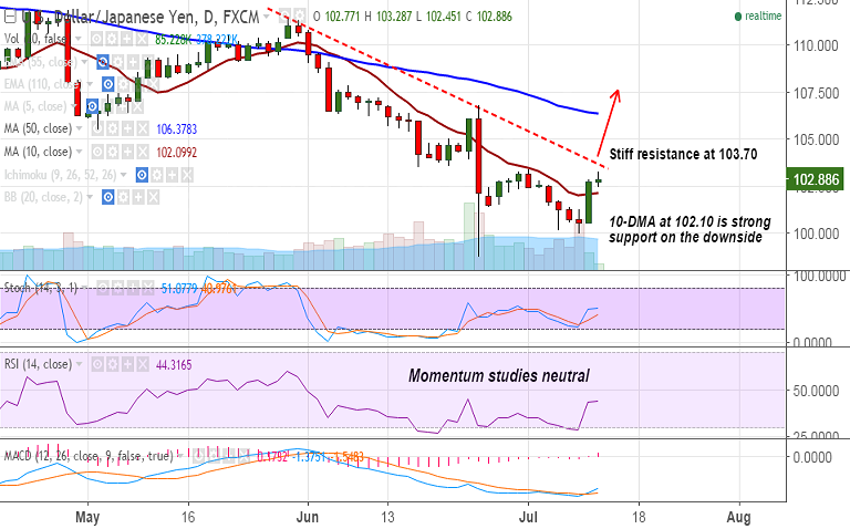 - The pair finds stiff resistance at 103.70, breakout above could see gains upto 105 levels.