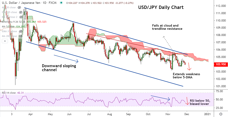 Recovery attempts were capped at 21-EMA and price action has broken below 5-DMA support which is now capping upside at 104.29.