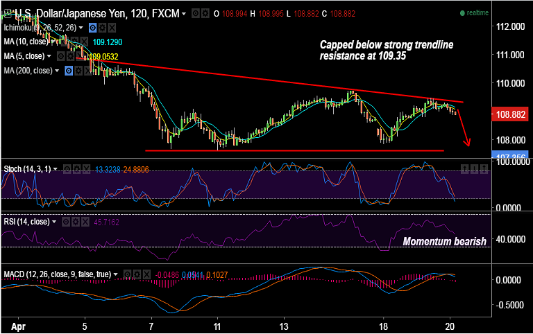 - Bearish invalidation on breaks above falling trendline resistance at 109.35.