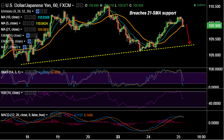 - Yen back on the bids, pushes USD/JPY lower. Pair slips below the 110 handle. Breaks 1H 21-SMA at 109.90.