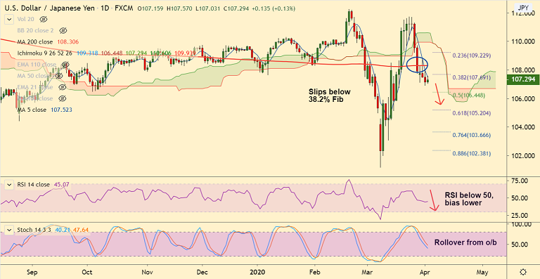 Upside was capped at 5-DMA at 107.52. Bearish 5-DMA crossover on 20-DMA adds to the bearish bias.