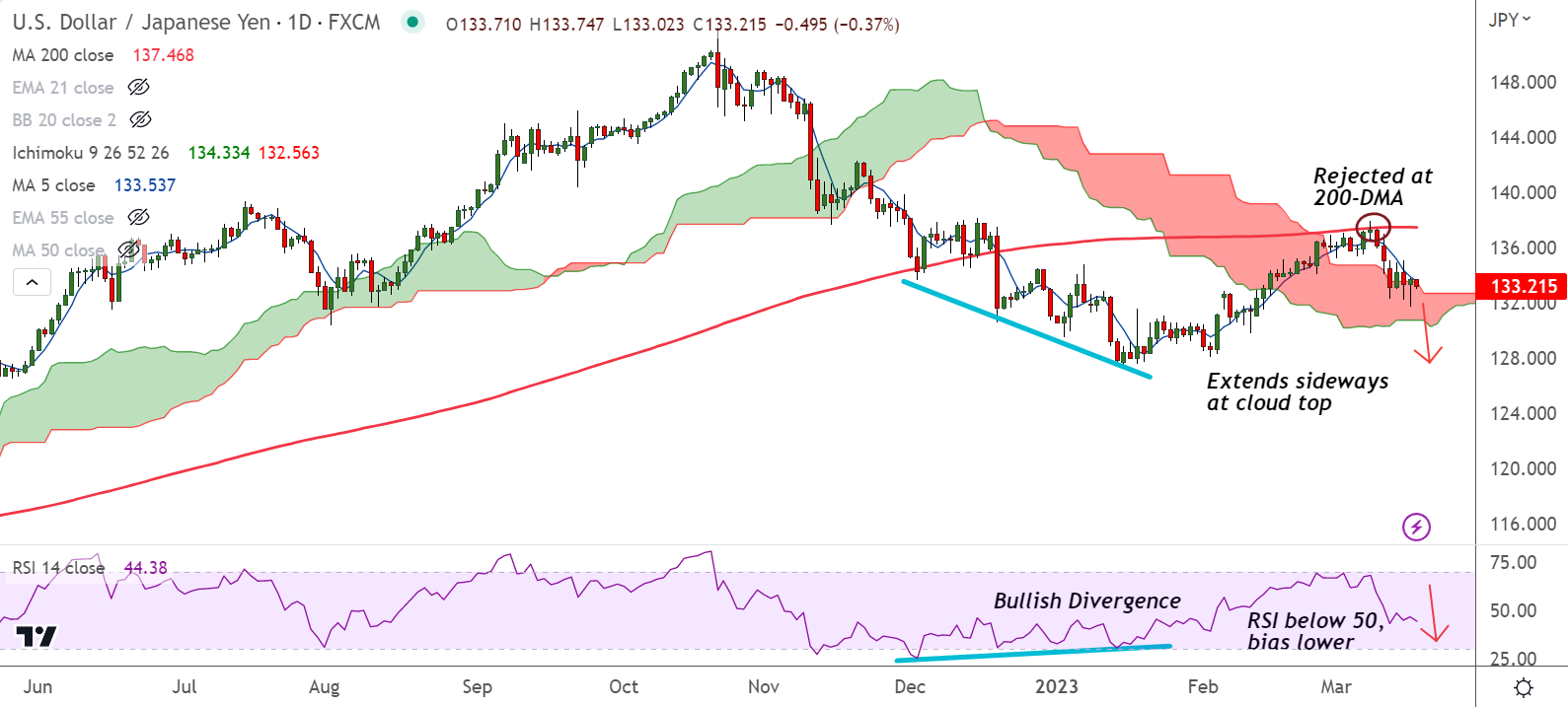 Summary: USD/JPY is extending sideways at daily cloud top support. Technical indicators are biased lower. Scope for further downside. FOMC meeting crucial for further direction.