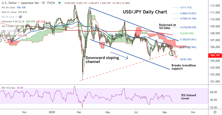 Price action has breached major trendline support at 105.11, next support lies at 104.18 (July 31st low).