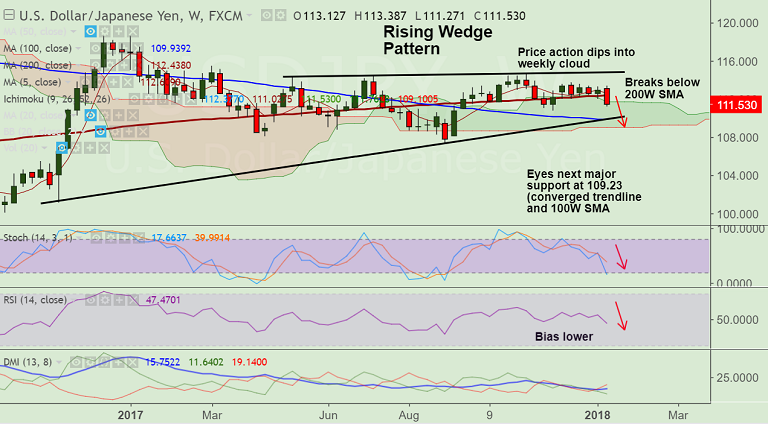 - The pair has breached 200W SMA support at 112.48 and price action has dipped into weekly cloud.