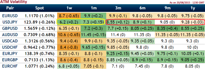 It is observed that the volatility of the 1M-1Y ATM contracts is projected to be creeping higher with global macro manipulations; especially Fed's rate hike is on the agenda. Chinese devaluation did not seem to impact much on Yen, one can make out that from last two days of yen's stability and gains yesterday, if you have to compare this with other Asian pairs then huge difference is seen. Hence, we believe Yen is waiting curiously to get benefitted from any outcome of the rate decision in short run.