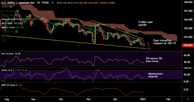 USD/JPY was trading marginally lower at 103.01 at around 04:25 GMT, bias tilted bearish.