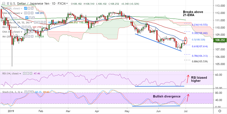Decisive close above 21-EMA required for further gains. Next bull target lies at 55-EMA at 109.16.