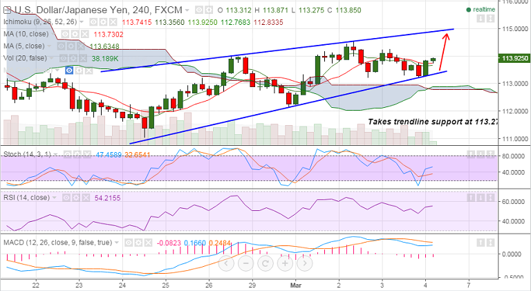 - USD/JPY has held rising trendline support at 113.27 on the 4 hourly charts and edges higher.