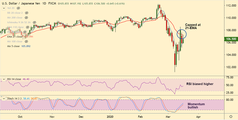 Summary: Coordinated efforts by central banks has reset risk across markets. That said, economic implications of the coronavirus pandemic are yet to be quantified. Goldman Sachs has slashed its US Q1 GDP growth forecast to 0% vs. 0.7% previous. Economists expect China's economy to see steep downside. Near-term upside in USD/JPY is seen above 21-EMA and decisive breakout above 200-DMA required for sustained upside resumption, which looks uncertain as of now.