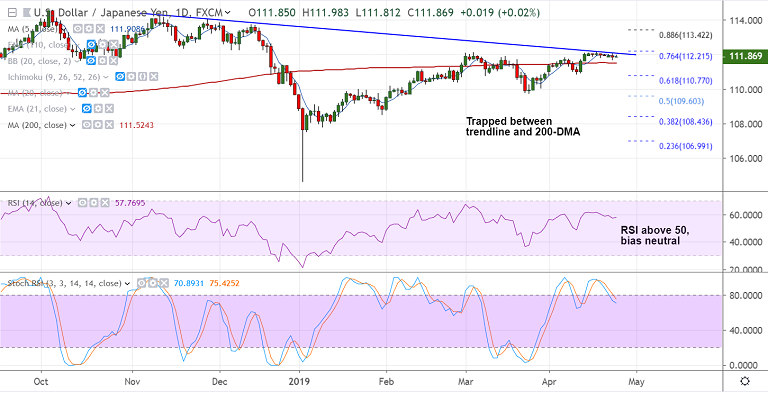 - USD/JPY continues to trade directionless, trapped between trendline and 200-DMA.