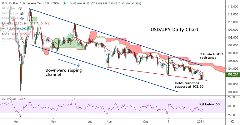 Supports below align at 103.06 (5-DMA), 102.60 (falling trendline), 102, 101.70 (trendline), 101.18 (March 2020 low).
