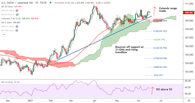 Summary: USD/JPY is extending sideways grind for the 2nd straight session amid pre-Fed trading lull. Technical bias remains bullish. Expectations for a less dovish Fed keeps downside limited. Bullish invalidation only below 21-EMA.