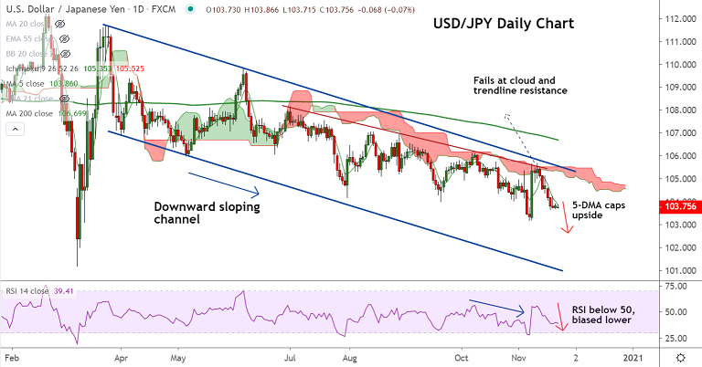 Upside remains capped at 5-DMA at 103.86. Break above could see minor gains. Bearish invalidation only above daily cloud.