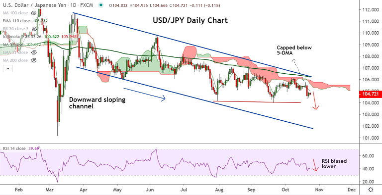 USD/JPY trades weaker on the day, down 0.11% at 104.71 at the time of writing, technical outlook is bearish.