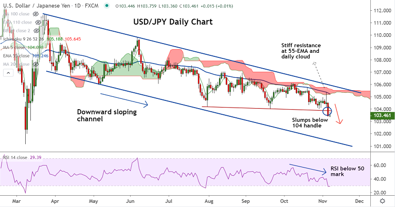 The major has slumped overnight to hit fresh 8-month lows below 104 handle. Price action has breached strong support at 104 which has opened downside.