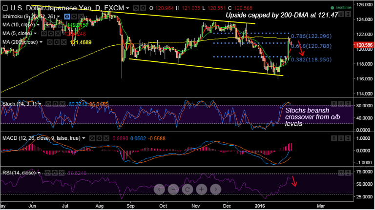 USD/JPY is unable to extend gains above 200-DMA at 121.47 which is strong resistance on the upside.