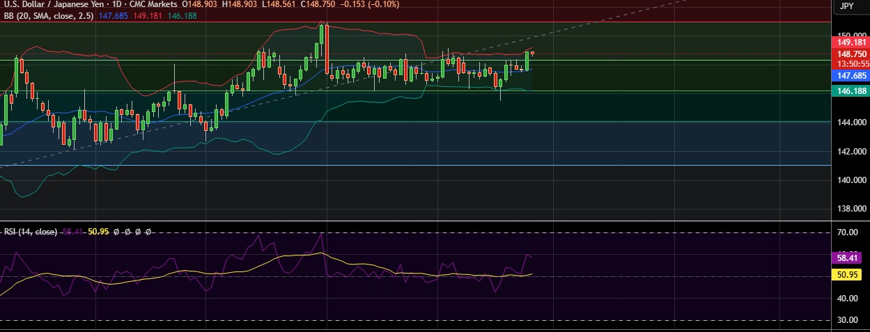 • Immediate resistance is located at 149.31(Higher BB), any close above will push the pair towards 150.00(Psychological level).