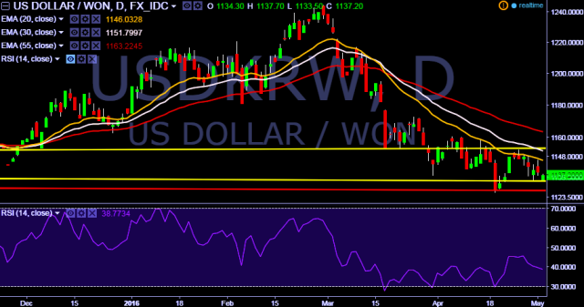 We prefer to take long position in USD/KRW at 1136, stop loss 1127 and target 1142/1153 levels.