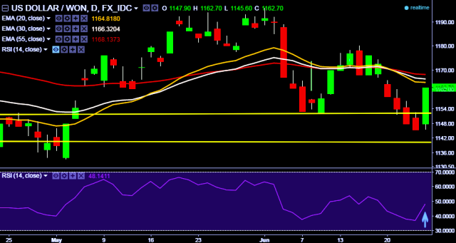We prefer to take short position in USD/KRW above 1160, stop loss 1175 and target 1138/ 1127 marks.