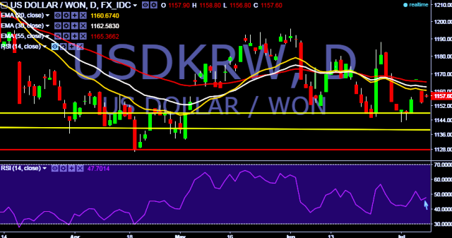 We prefer to take short position in USD/KRW only below 1152, stop loss 1162 and target 1142/ 1127 respectively.
