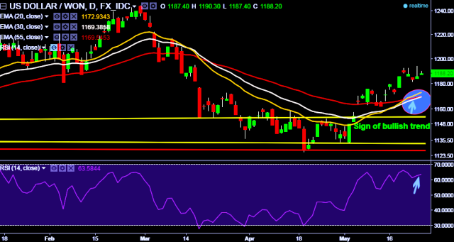 We prefer to take long position in USD/KRW around 1185, stop loss 1172 and target 1194/1209 marks.
