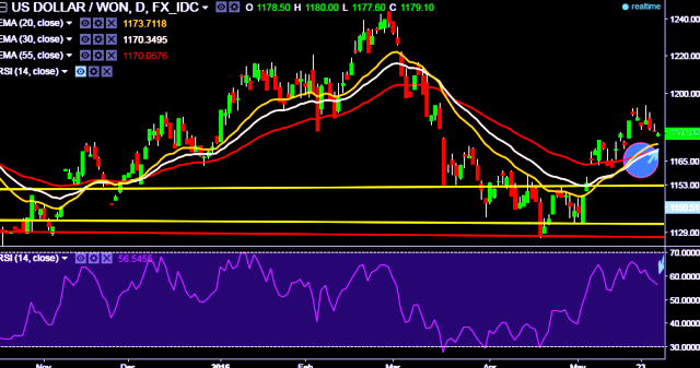 We prefer to take long position in USD/KRW only above 1182, stop loss 1172 and target 1195 marks.