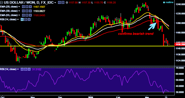 We prefer to take short position in USD/KRW around 1157, stop loss 1164 and target 1142/ 1129 levels.