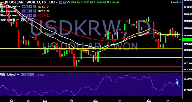 We prefer to take short position in USD/KRW only below 1162, stop loss 1176 and target 1152/1148 marks.