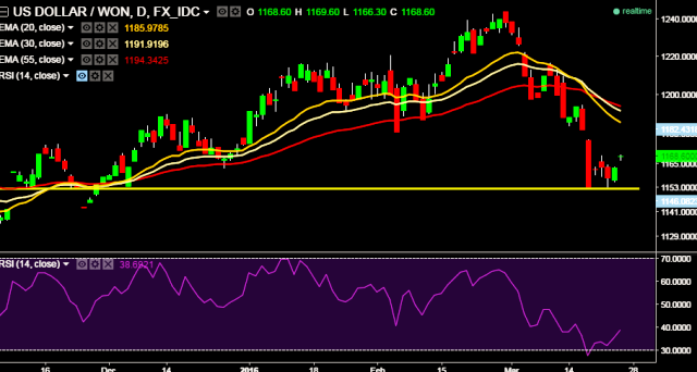 We prefer to take long position in USD/KRW around 1167, stop loss 1153 and target 1180/ 1193 levels.