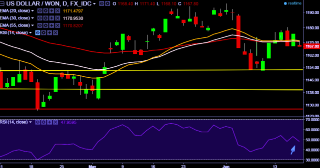 We prefer to take short position in USD/KRW only below 1168, stop loss 1176 and target 1152 marks.