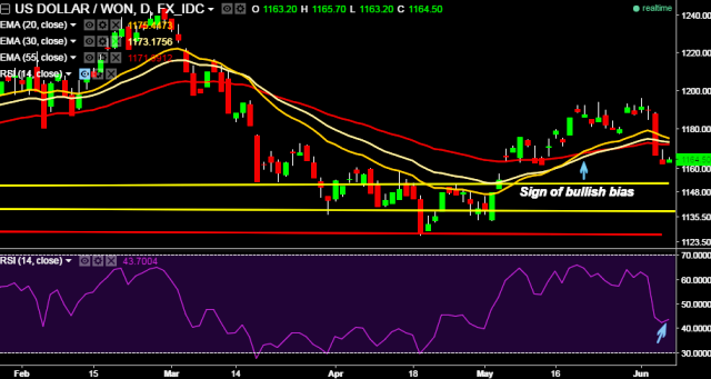 We prefer to take long position in USD/KRW only above 1169, stop loss 1162 and target 1194 marks.