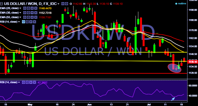 We prefer to take long position in USD/KRW only above 1142, stop loss 1128 and target 1152/ 1168 marks.
