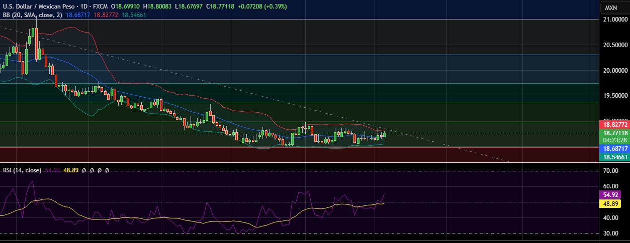 • Support is seen at 18.687(SMA 20) and break below could take the pair towards 18.550(Lower BB).