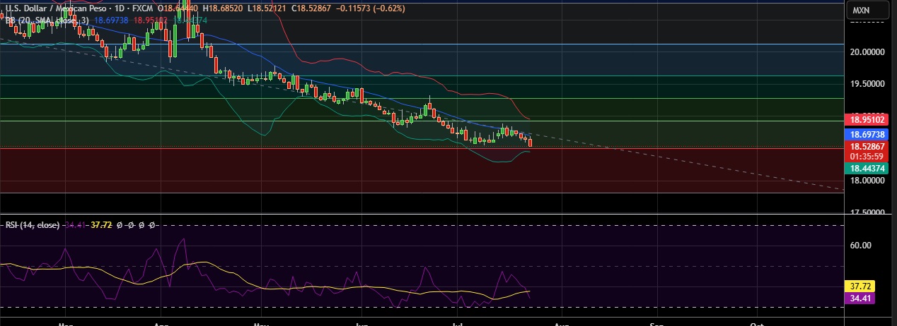 • USD/MXN edged lower on Wednesday as optimism over a potential more trade deals boosted the Mexican peso.