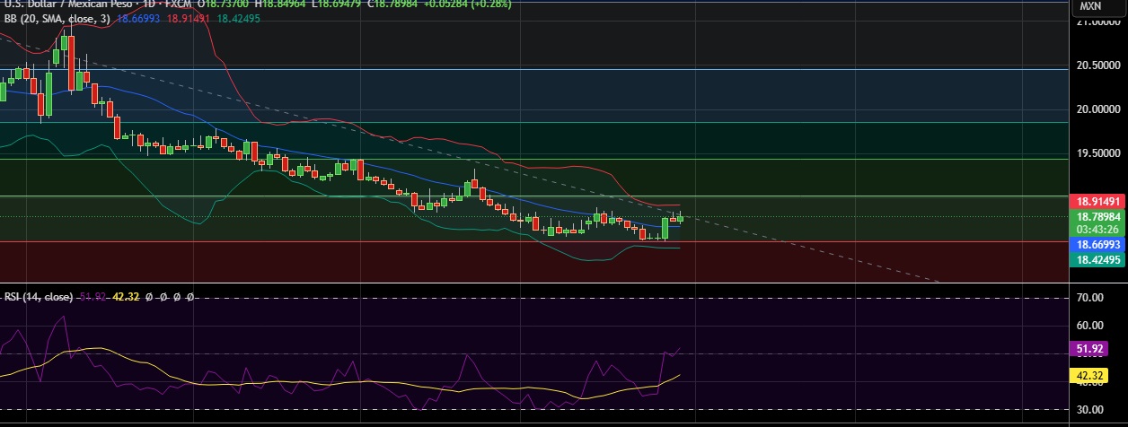 • Support is seen at 18.685 (SMA 20) and break below could take the pair towards 18.502 (23.6%fib).