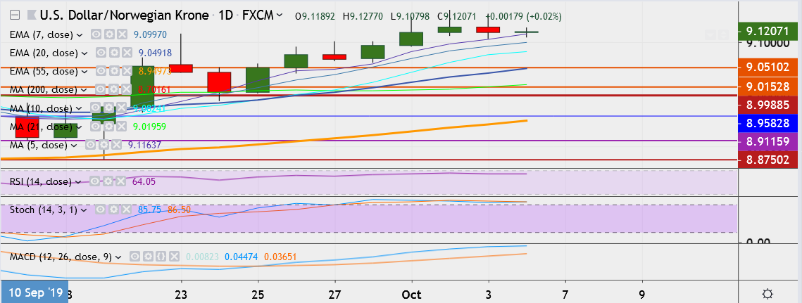 - On the downside, support is around 9.0927 (7-EMA), break below could take it till 9.0752 (10-DMA).